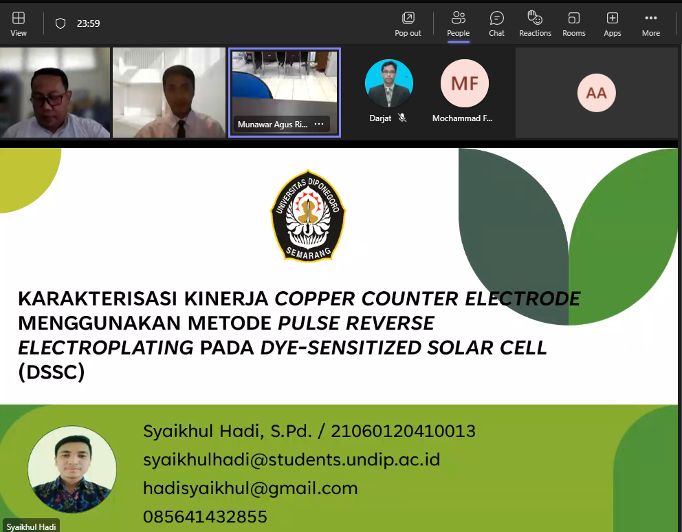 - Judul proposal tesis = Karakterisasi kinerja copper counter electrode menggunakan metode pulse reverse electroplating pada dye sensitized solar cell (dssc)